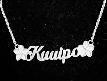 ![]() Example of "Gold ID bracelet with birthstones" & "Gold Bamboo cut-out bangle bracelet with clasp" | ![]() Example of our Scroll background finish | ![]() Example of our Enameled Kahilis next to name | ![]() Example of our #30 Lokelani Roses scroll | ![]() Example of our Rosette background finish |
